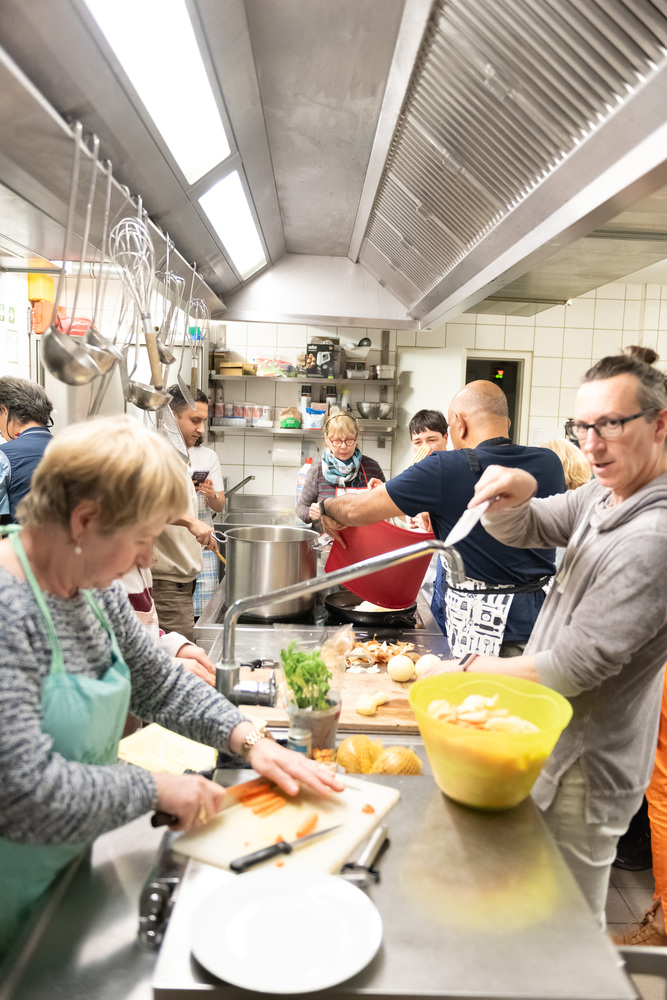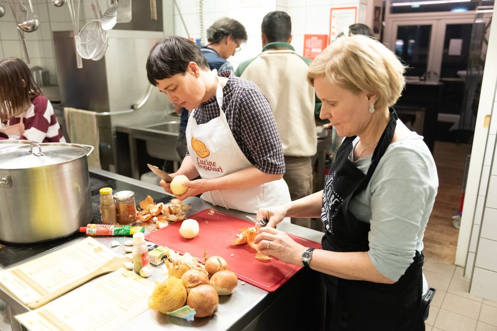 Mit großer Begeisterung wurde geschnippelt, gerührt und gekostet. Bald wurde es heiß und eng in der AAI-Küche – aber genau das führte dazu, dass sich die Teilnehmer*innen rasch näherkamen und sich in angeregte Gespräche vertieften.