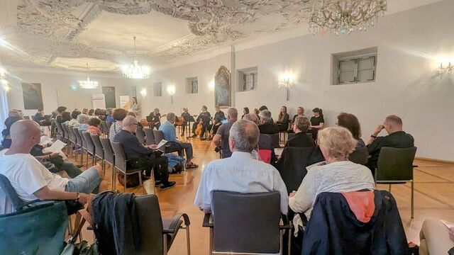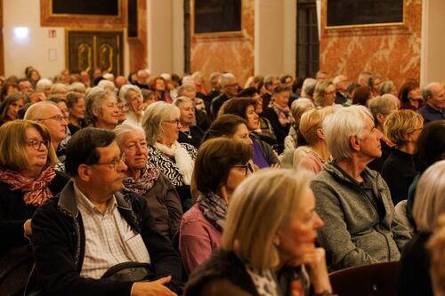 Umrahmt und thematisch gestützt wurde die Lesung durch das St.-Thomas-Consort des Johann-Joseph-Fux-Konservatoriums (Fachbereichs ,Alte Musik‘, Leitung: Claire Pottinger-Schmidt), das Auszüge aus seinem Konzertprogramm ,Da pacem‘ zum Besten gab: Mit Barock- und Renaissanceklängen von Thomas Crécquilon, Cristoforo Caresana sowie Rognoni Taeggio vermittelte das elfköpfige Ensemble die menschliche Trauer um das Verlassensein vom Glück in Kriegszeiten sowie die zeitunabhängig Botschaft vom notwendigen Frieden.