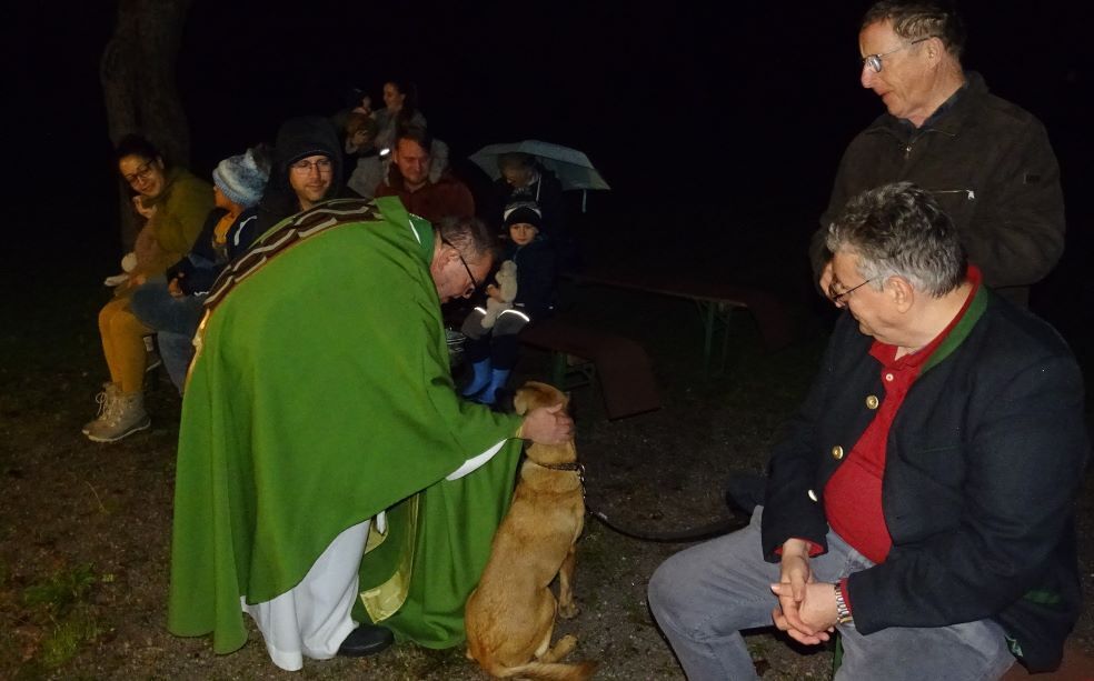 Am Samstag, 4. Oktober lud Pfarrer Ruthofer zur Tiersegnung in den Klostergarten. Zur Vorabendmesse kamen kleine und große Tierfreunde. Pfarrer Ruthofer segnete Hasen, Bären, Hunde, eine Maus und einen Riesen-Hai mit Weihwasser und vom Schöpfer des Himmels und der Erde wurden auch alle Besucher mit zarten Regentropfen beglückt!
