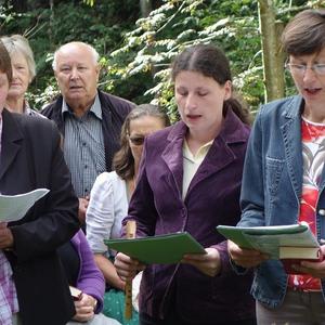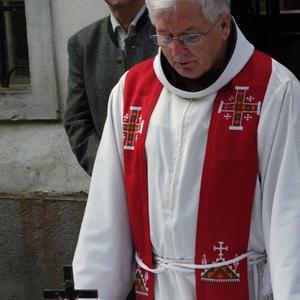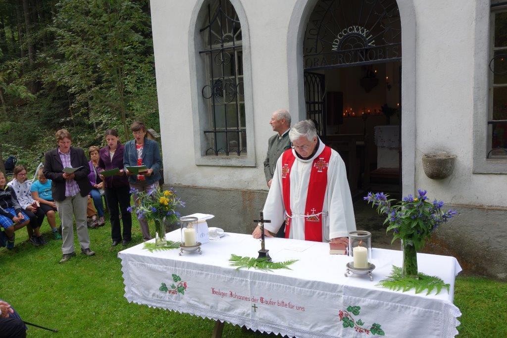 In Vertretung des Fußwallfahrers P. Simon zelebrierte Franziskaner-Guardian P. Josef Höller aus Graz in launiger Weise die Eucharistie, zu der rund 80 Gläubige bei herrlichem Wetter zu Fuß, mit den Fahrrädern oder per Auto gekommen sind.