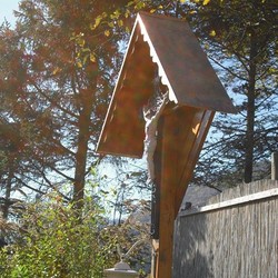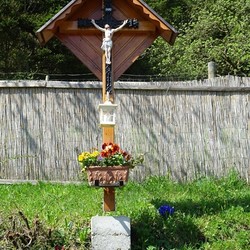 Unter dem Kruzifix sind eine weiße Laterne und ein Blumenkisterl angebracht. Ein Betonfundament sorgt für einen sicheren Standort. Sohn Patrik Neuherz, ein gelernter Spengler, stattete dieses Wegkreuz kunstvoll mit einem Kupferdach aus. Zwischen den gepflanzten Sträuchern ist auch ein Zugang möglich.