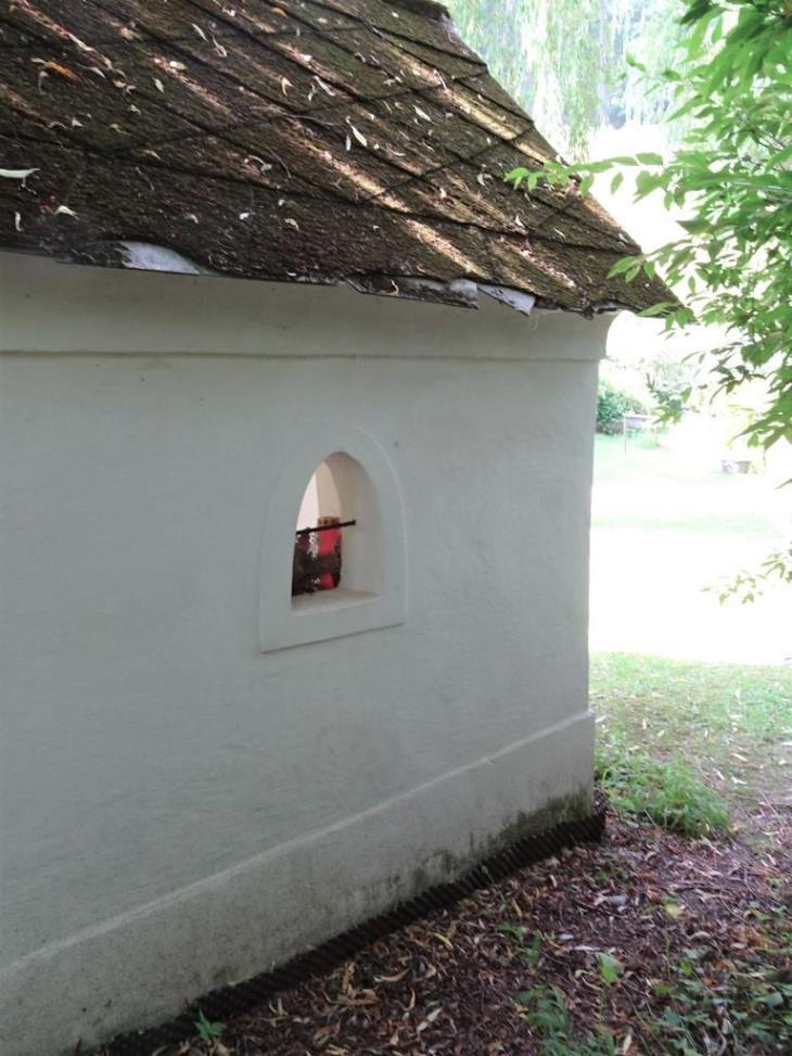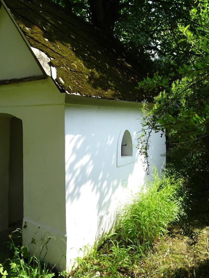 Das Baujahr dieses Kleindenkmals ist leider nicht bekannt. Man weiß aber, dass es eine sehr alte Bausubstanz hat: Unter dem Verputz verbergen sich vermutlich Steinmauern. Die Kapelle ist mit einem Satteldach versehen und mit Eternitplatten gedeckt. Die Eingangsstufe ist noch im Original vorhanden, der Terrazzoboden wurde nachträglich gelegt. An den zwei Seitenwänden befindet sich jeweils eine Öffnung, an der Rückseite ist eine kreisrunde Ausnehmung unter dem Dach vorhanden, in der einst die Grab-Holzkreuze der verstorbenen Angehörigen abgelegt wurden.