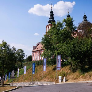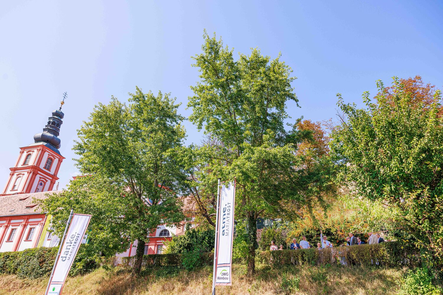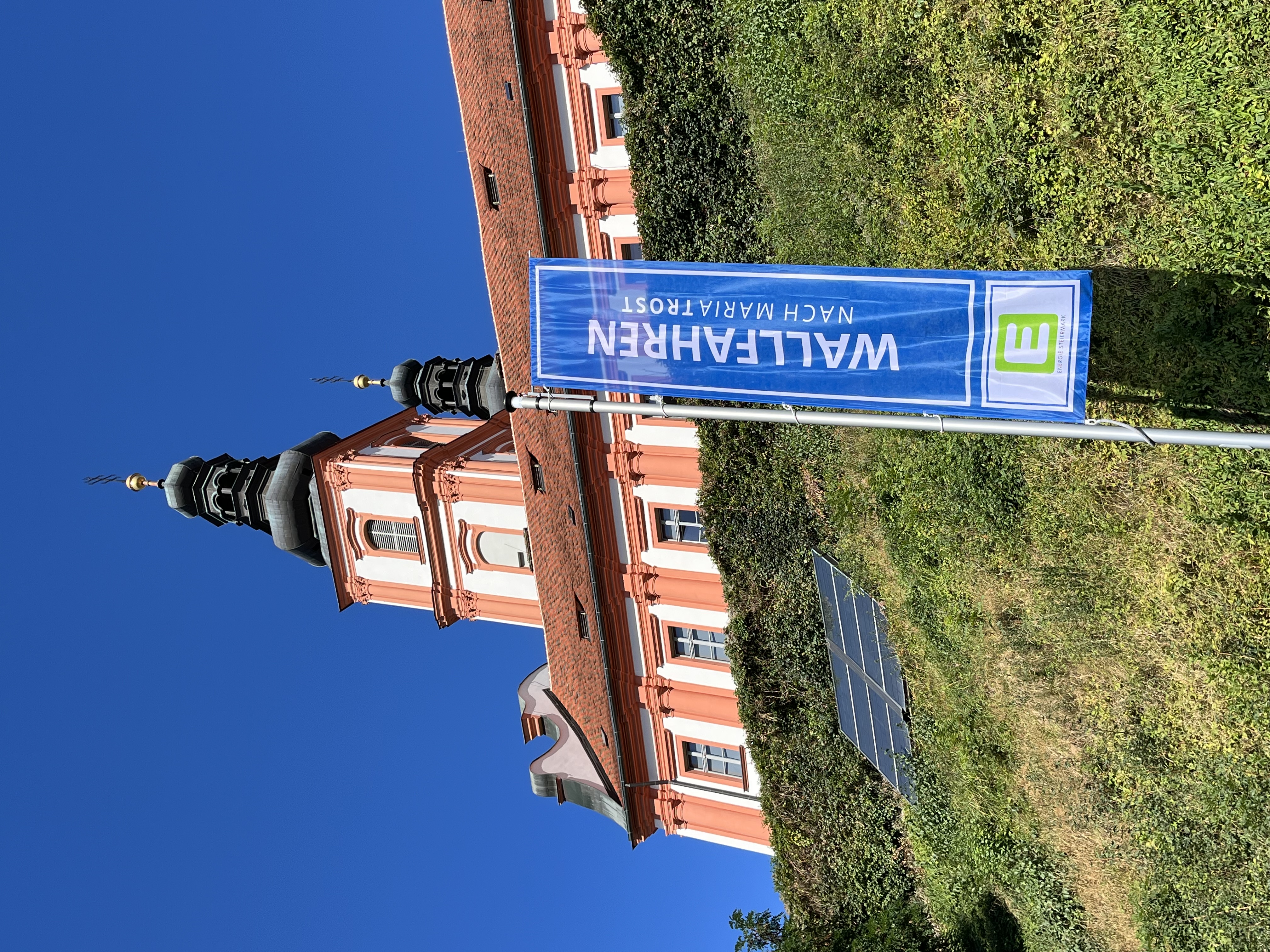 Mit einem Gedankenimpuls laden die Fahnen die Besuchenden zu einem vielfältigen Erleben von MARIATROST ein.