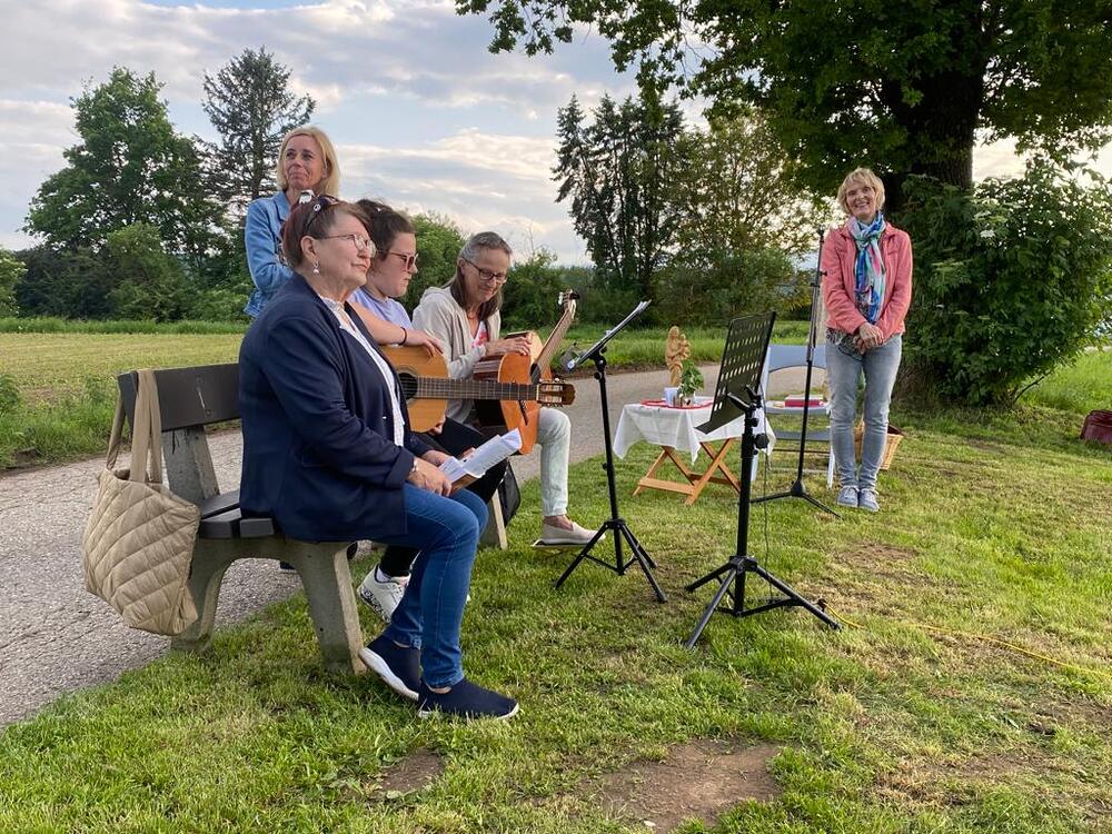 Wie alljährlich hat der KiLi-Chor auch heuer wieder eine Maiandacht beim Bildstock von Hans Koch gestaltet. Das Thema dieser Feier war "Maria, Königin des Friedens". Wir beteten für den Frieden im Kleinen und im Großen. Anschließend gab es noch ein gemütliches Beisamensein im wunderschönen Garten unseres Mesners.