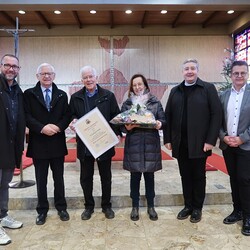 Pfarrer Claudiu Budau und Wolfgang Garber vom Führungsteam gratulierten Gerhard mit einer bischöflichen Urkunde zu seinem 80. Geburtstag sowie fast 50 jährigem Ehrenamt in der Pfarre Lieboch.