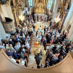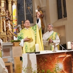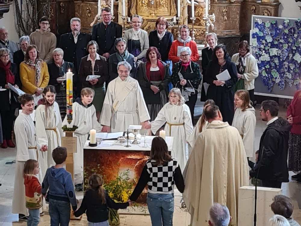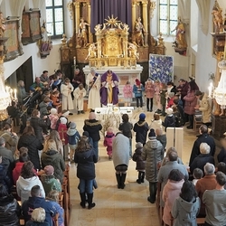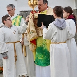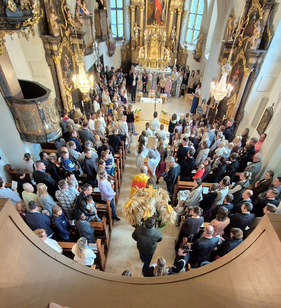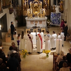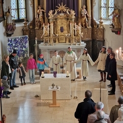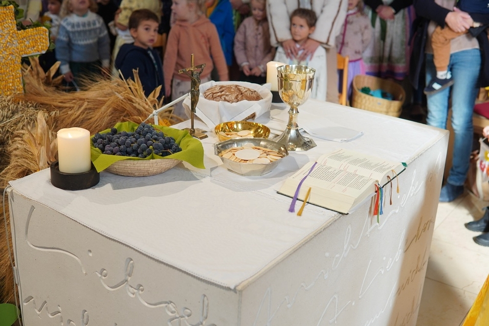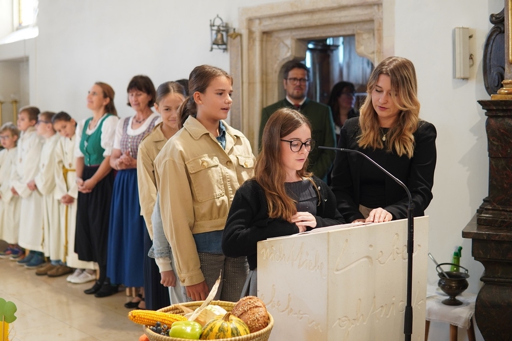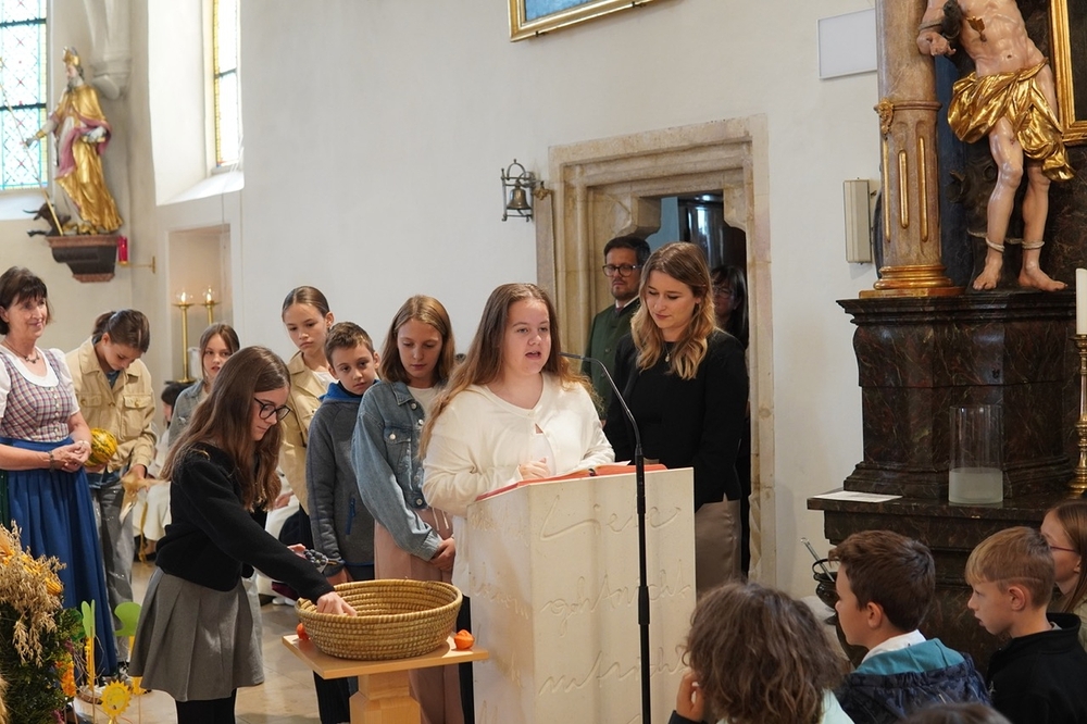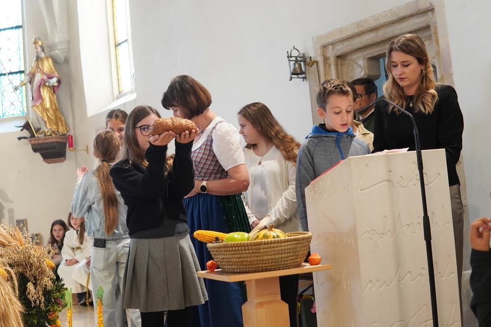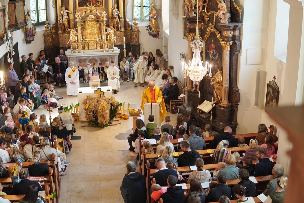 Voll Dankbarkeit und Freude feierten wir das diesjährige Erntedankfest in unserer mit großen und kleinen Leuten gut gefüllten Kirche. Vikar Norbert Glaser zelebrierte die heilige Messe, assistiert von Diakon Michi Zepf und sieben tüchtigen Minis.