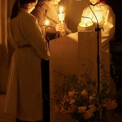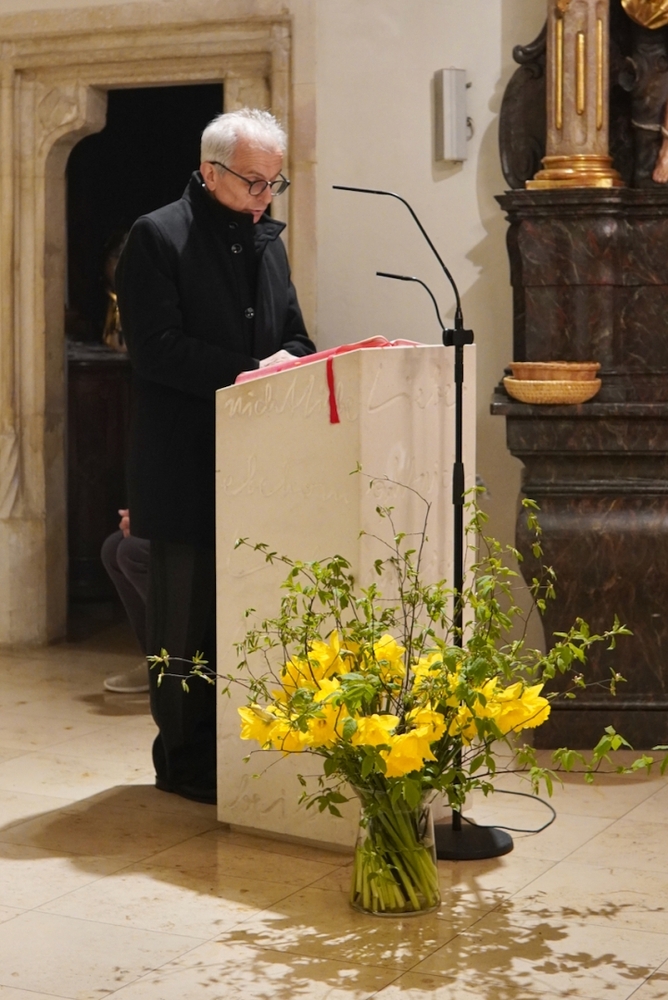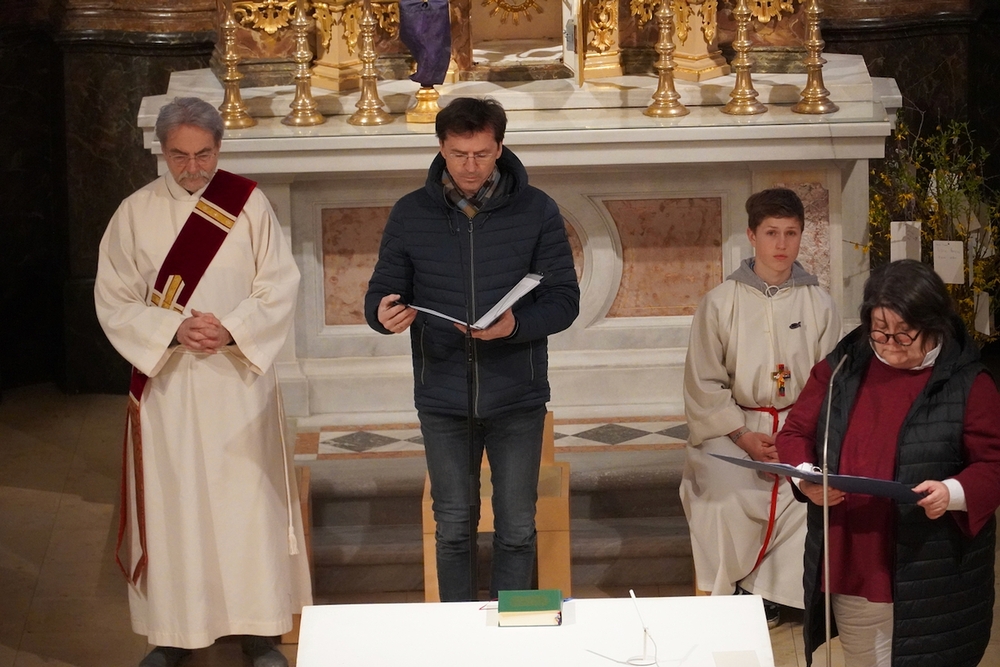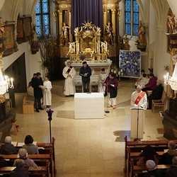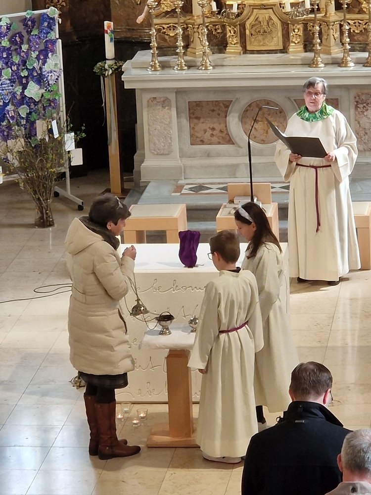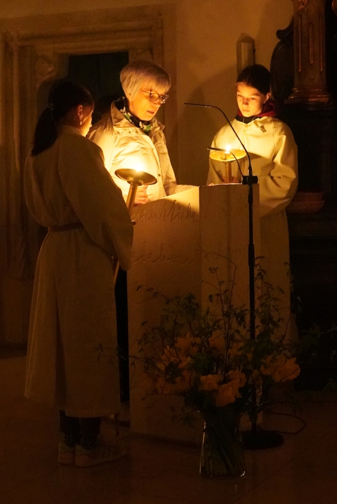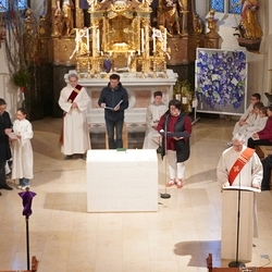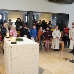 Vor dem Altar brannten 59 Teelichter für alle Menschen, die im letzten Jahr in unserer Pfarre verstorben sind. Ihre Namen wurden noch einmal laut ausgesprochen. Ein Teelicht leuchtete für alle Verstorbenen, die ungenannt blieben.
