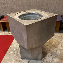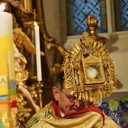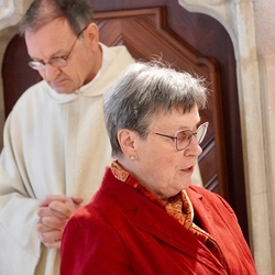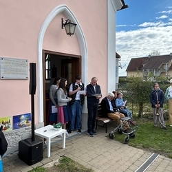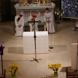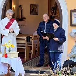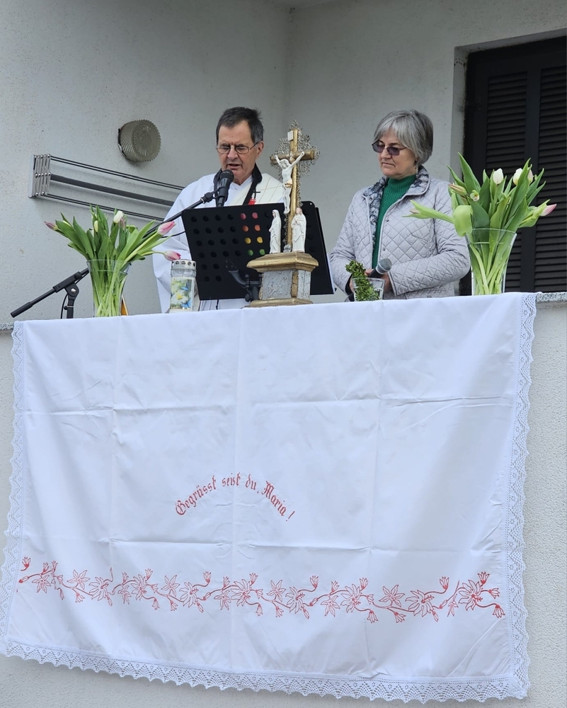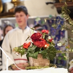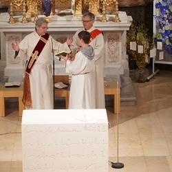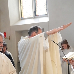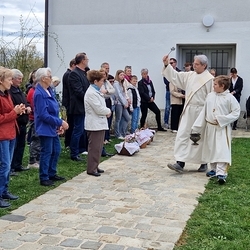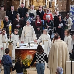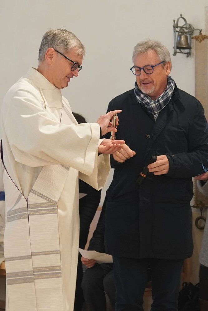 Vor dem Schlusssegen überreichte Ernst Pock im Namen der Pfarre dem neuen Diakon ein Aspergill, mit dem dieser gleich voll Freude die Gläubigen segnete. Für seine Ehefrau Eva, die ihm begleitend zur Seite steht, gab es einen Blumenstrauß, mit den besten Wünschen für sie.
