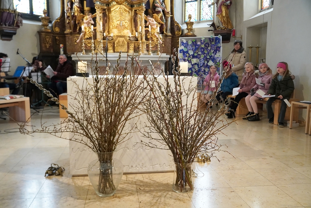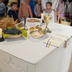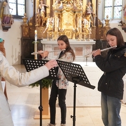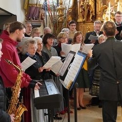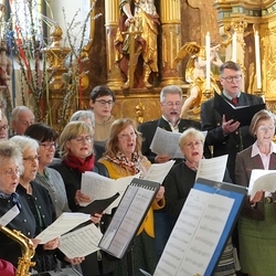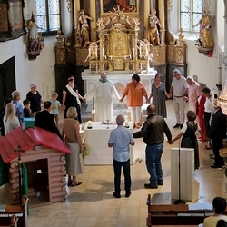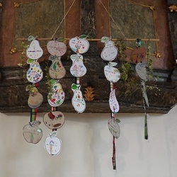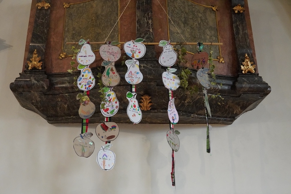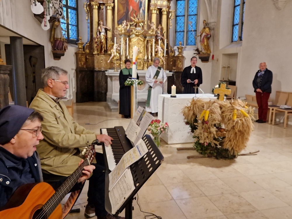 Von der schwungvollen Musik unserer Musikgruppe begeistert, sangen wirklich alle gerne mit, vom  Kirchenchor bis zu den VS-Kindern, deren besonderer Erntedankschmuck übrigens nun die Empore im Altarraum ziert.