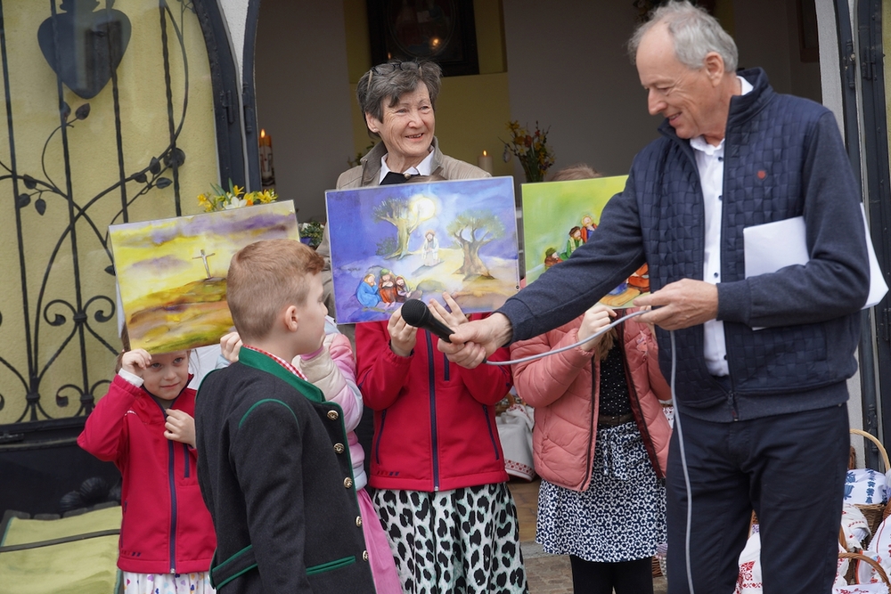 Mit dem „Erntedank-Tanz“ brachten die Kindergarten- und Kinderkrippenkinder buntes Leben in die Feier, auch das „Vater unser“ sowie das „Farbenlied“ lockten sie und alle anderen Kinder aus der Reserve.