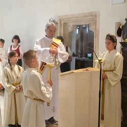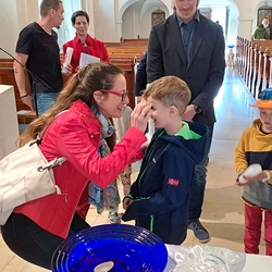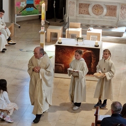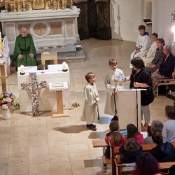 Die Erstkommunionkinder durften gemeinsam mit ihren Taufpaten/Taufpatinnen feierlich in die Kirche einziehen. Die Symbole der heiligen Taufe wurden vorgestellt und anschließend konnten die Patinnen/Paten und die Kinder ihr Taufversprechen sowie das Glaubensbekenntnis erneuern.