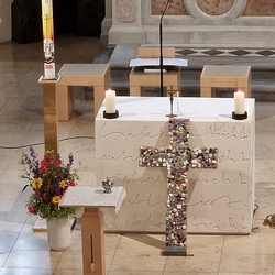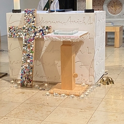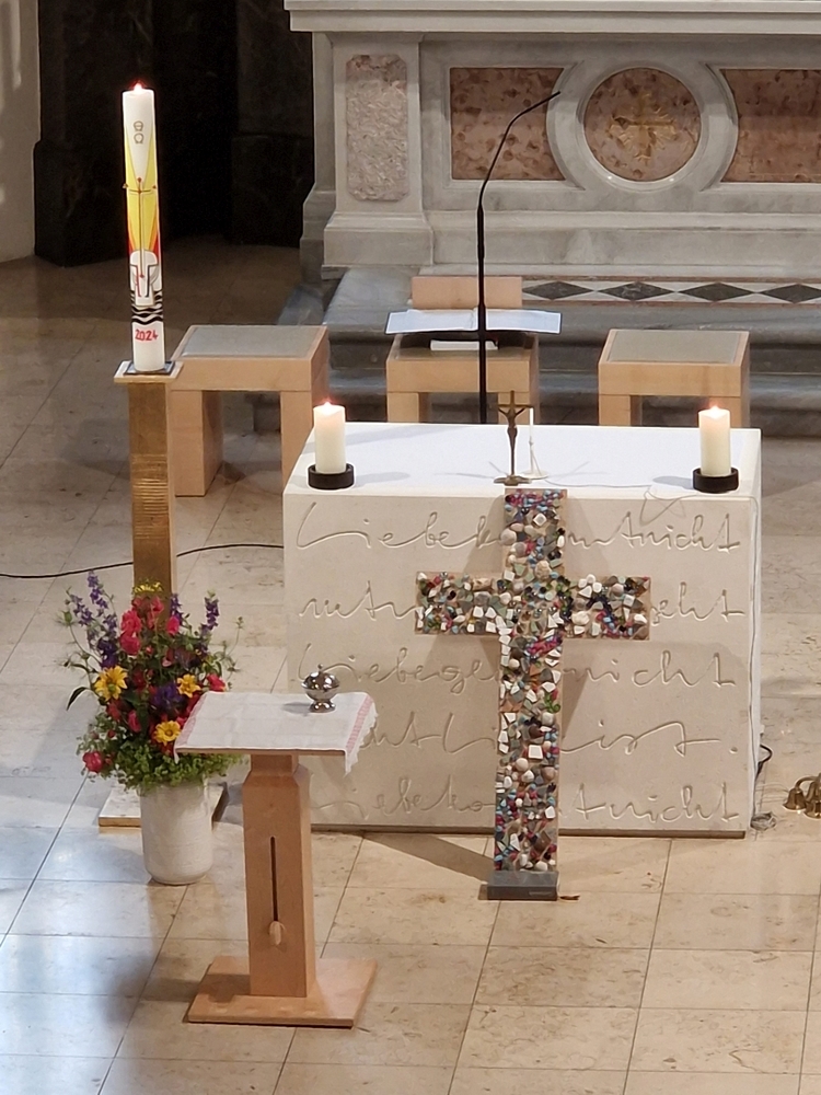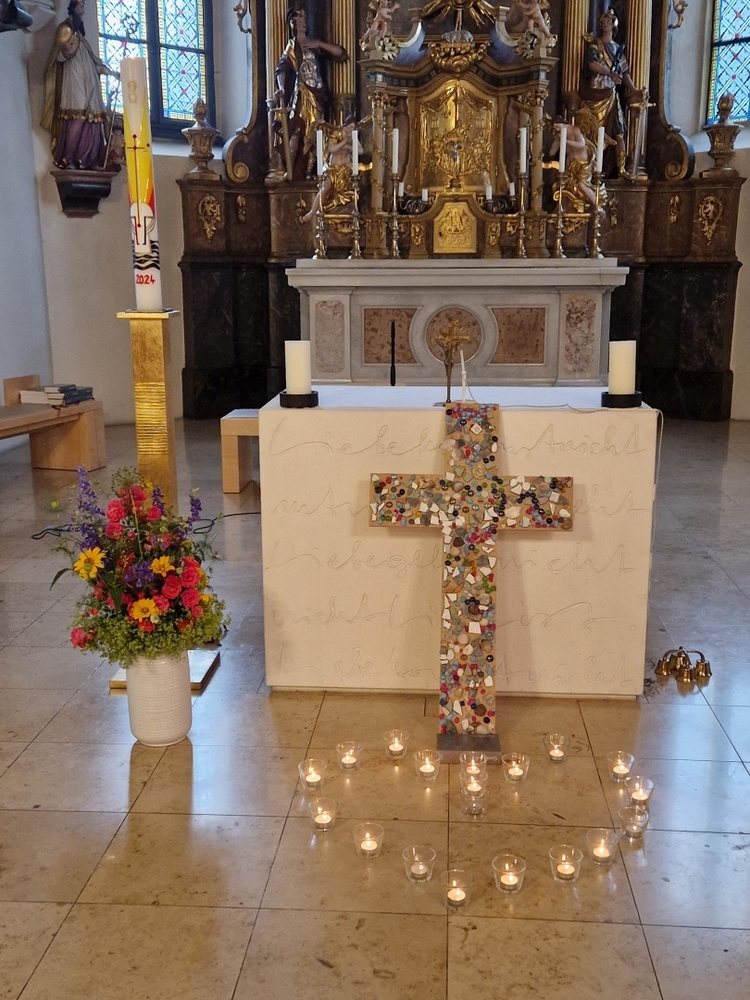 Die Lichter vor dem bunten Kreuz künden von der Wort-Gottes-Feier, die Elisabeth Schöpf am 9. Juni, dem Vatertag, in unserer Kirche gestaltete.
