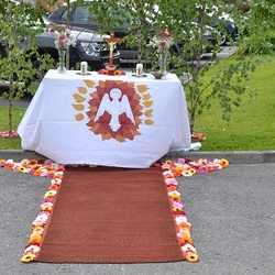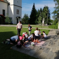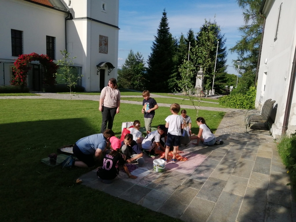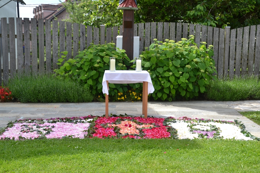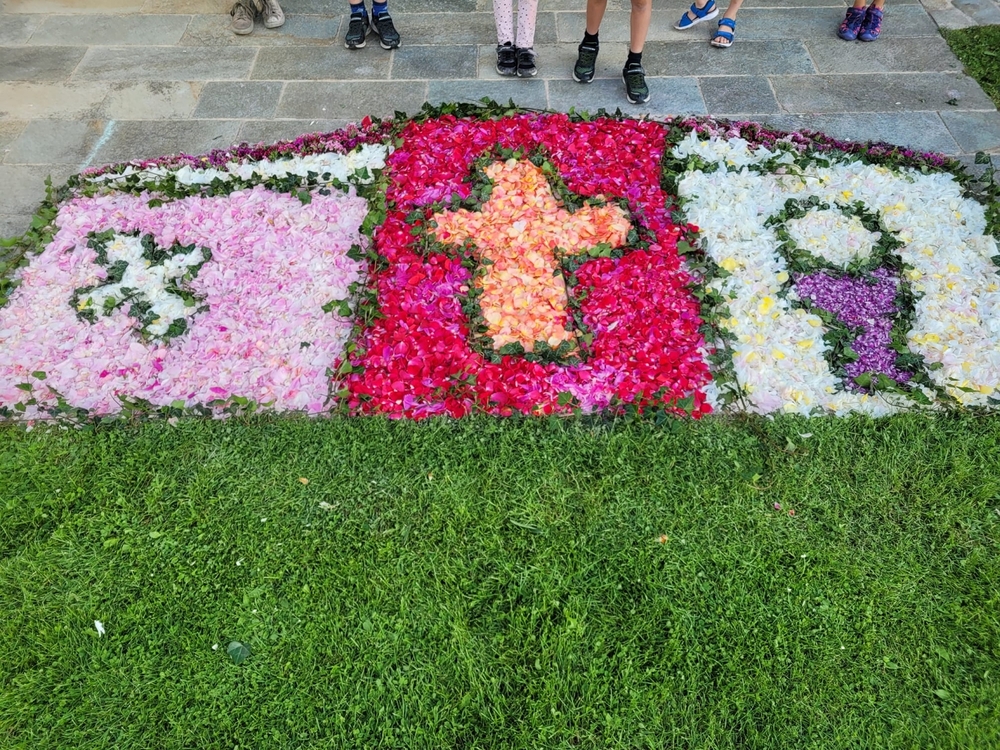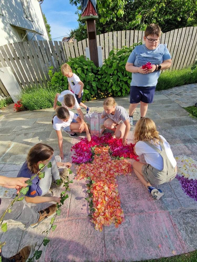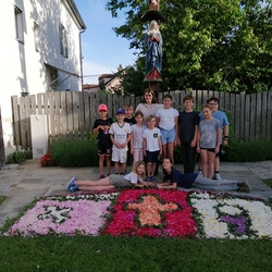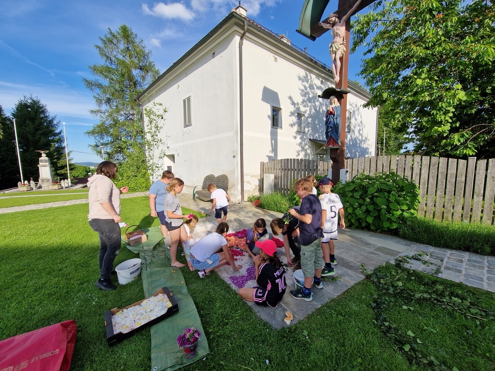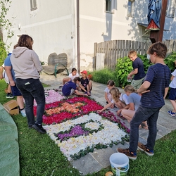 Mit großer Freude und Kreativität legten auch heuer die Minis am Vorabend zu Fronleichnam ein Blumenbild, diesmal sogar ein Tryptichon: Kelch und Brot, ein Kreuz und eine Taube wurden mit viel Eifer zuerst aufgemalt und dann mit den Blüten gestaltet.