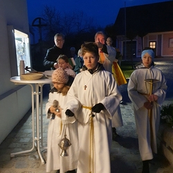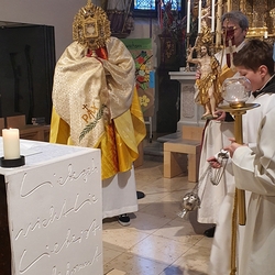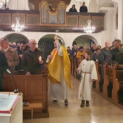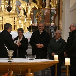 Nach altem Ritus segnete Diakon Michi Zepf nach dem Schlusssegen noch das „Dreikönigswasser“ und das Salz, welches in kleinen Fläschchen mitgenommen werden durfte. Die Allerheiligen-Litanei wurde von Johannes Chum vorgetragen.