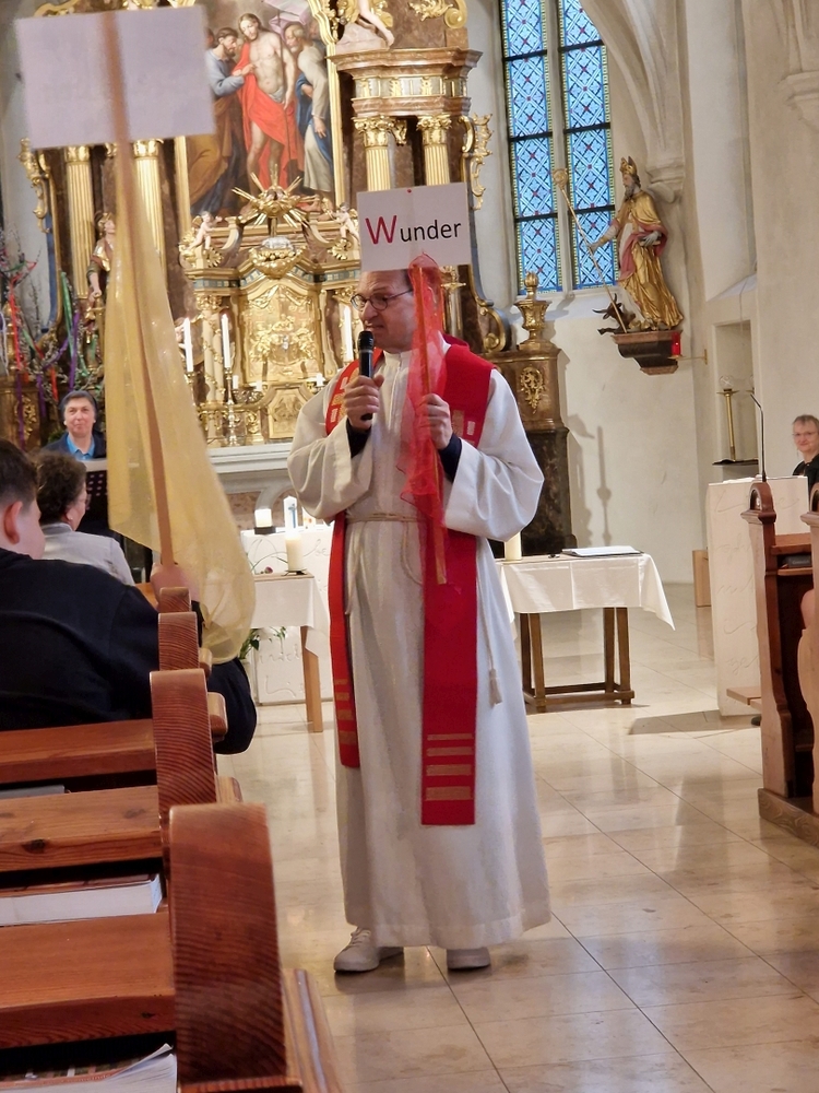 Die Auferstehungsfeier zelebrierten Vikar Gerhard Hatzmann und Diakon Michi Zepf, zusammen mit den Minis, den Lektorinnen und Lektoren, mit Kantor und Kantorin, der Musikgruppe und allen Gläubigen.