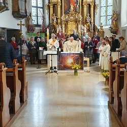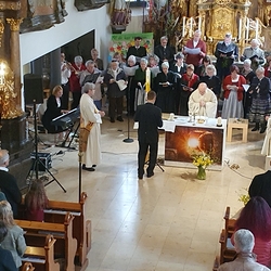 So feierten Groß und Klein mit Vikar Gerhard Hatzmann und Diakon Michi Zepf die heilige Messe zum Palmsonntag in einem schönen Miteinander. Die Kindergartenkinder sowie einige MS-Schülerinnen gestalteten die Feier mit und die MINIS versahen nicht nur ihren Dienst am Altar, sondern trugen auch die „Passion“ vor - in einer einfacheren Fassung, mit passenden Liedstrophen und Symbolen. Auch die Landjugend nahm teil und kam nach guter Tradition mit ihrem großen Palmbuschen.