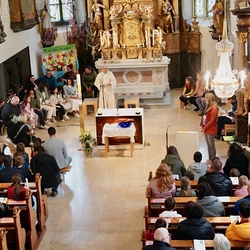 So konnte nach der heiligen Messe mit Vikar Norbert Glaser und Diakon Michi Zepf die Prozession wie geplant ihren Weg nehmen. An den vier Altären, die liebevoll geschmückt waren, wurde das Wort Gottes verkündet und Lobpreis, Dank und Bitte in Gebeten und Liedern ausgedrückt.